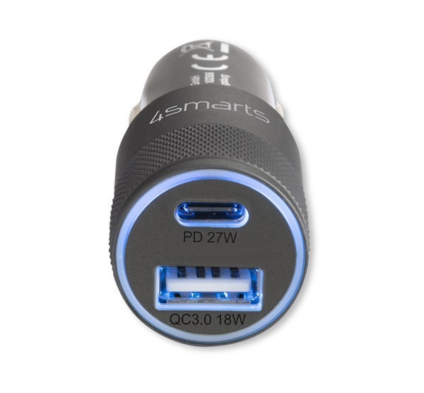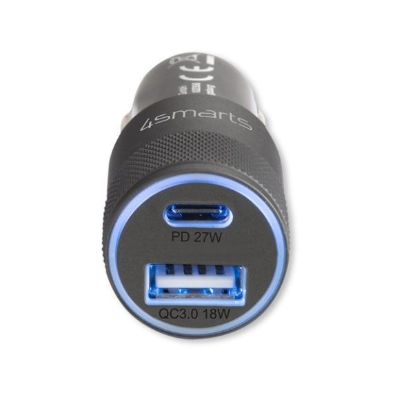 4smarts Rapid+ autós szivargyújtó gyorstöltő, USB-C + USB, PD, 27W, szürke