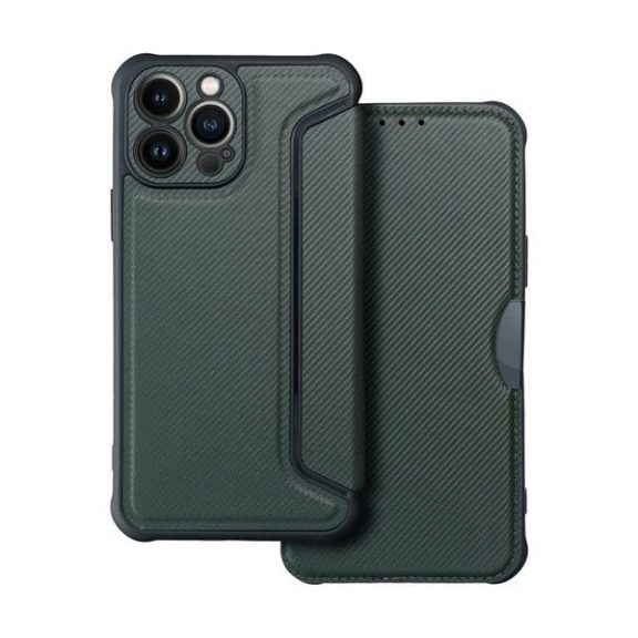 Apple iPhone 13 Pro Max, Oldalra nyíló tok, légpárnás sarok, bőrhatású, karbon minta, Razor Book, zöld