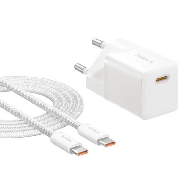 Baseus GaN5 Mini USB-C hálózati gyorstöltő adapter 25W, + USB-C-USB-C fonott kábel, 100W, fekete