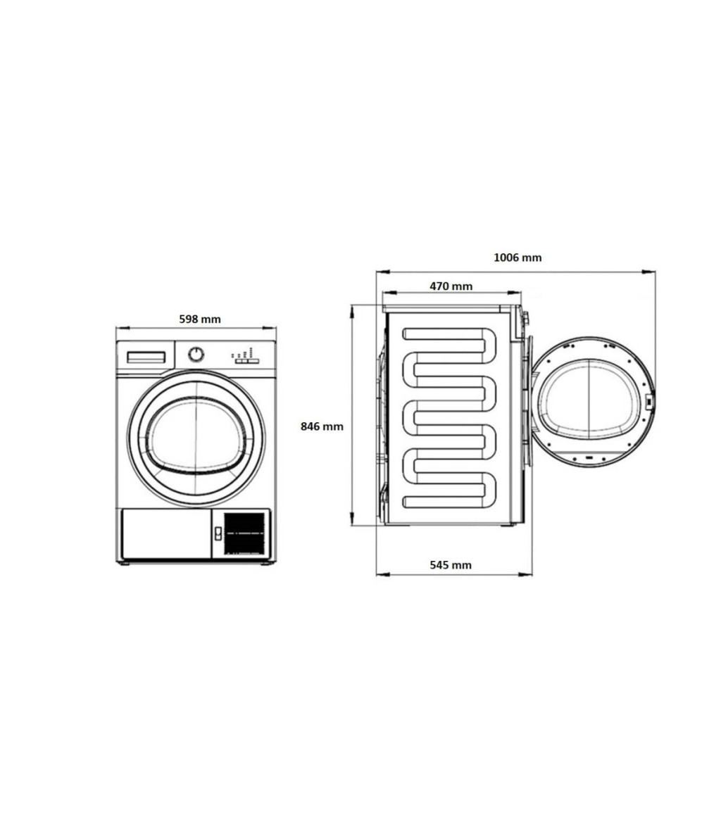 Szárítógép - keskeny kialakítású, hőszivattyús, szabadonálló modell, D energiaosztályú, szárítási hatékonysága B besorolású, maximális szárítási kapacitása 7 kg, 64 dB -es zajszint, energiafogyasztása 109 kWh/100 mosási ciklus, FragranceDos technológiával, SensitiveDrying technológiával, késleltetett indítás, kijelző, gyerekzár és mobiltelefonos vezérlés funkcióval, mérete 84,6 × 59,8 × 54,5 cm (Ma×Sz×M), 39,5 kg tömegű, lefolyó-csatlakozó készlettel