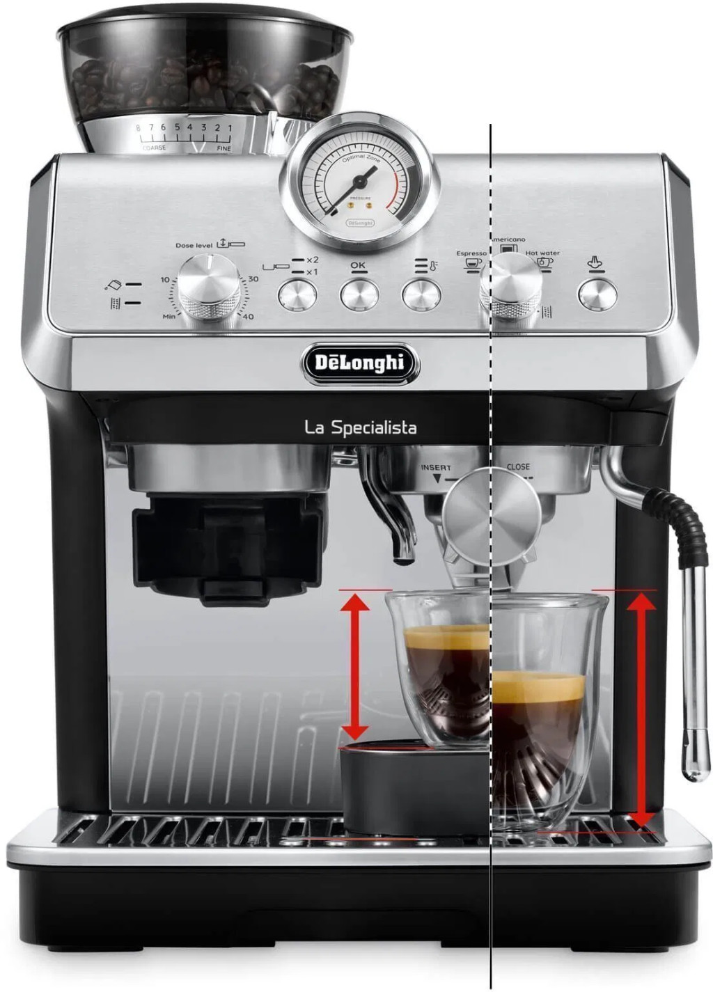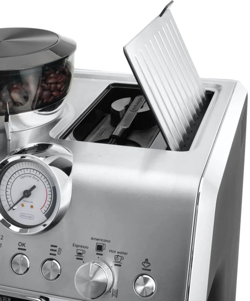 víztartály, nyomásmérő/manométer, beépített kávédaráló és tejadagolás, manuális gombok, állítható magasságú állvány, tárolóhely a poharaknak és csészemelegítés, gőzfúvóka, vízkőtelenítő rendszer és vízszűrő használat