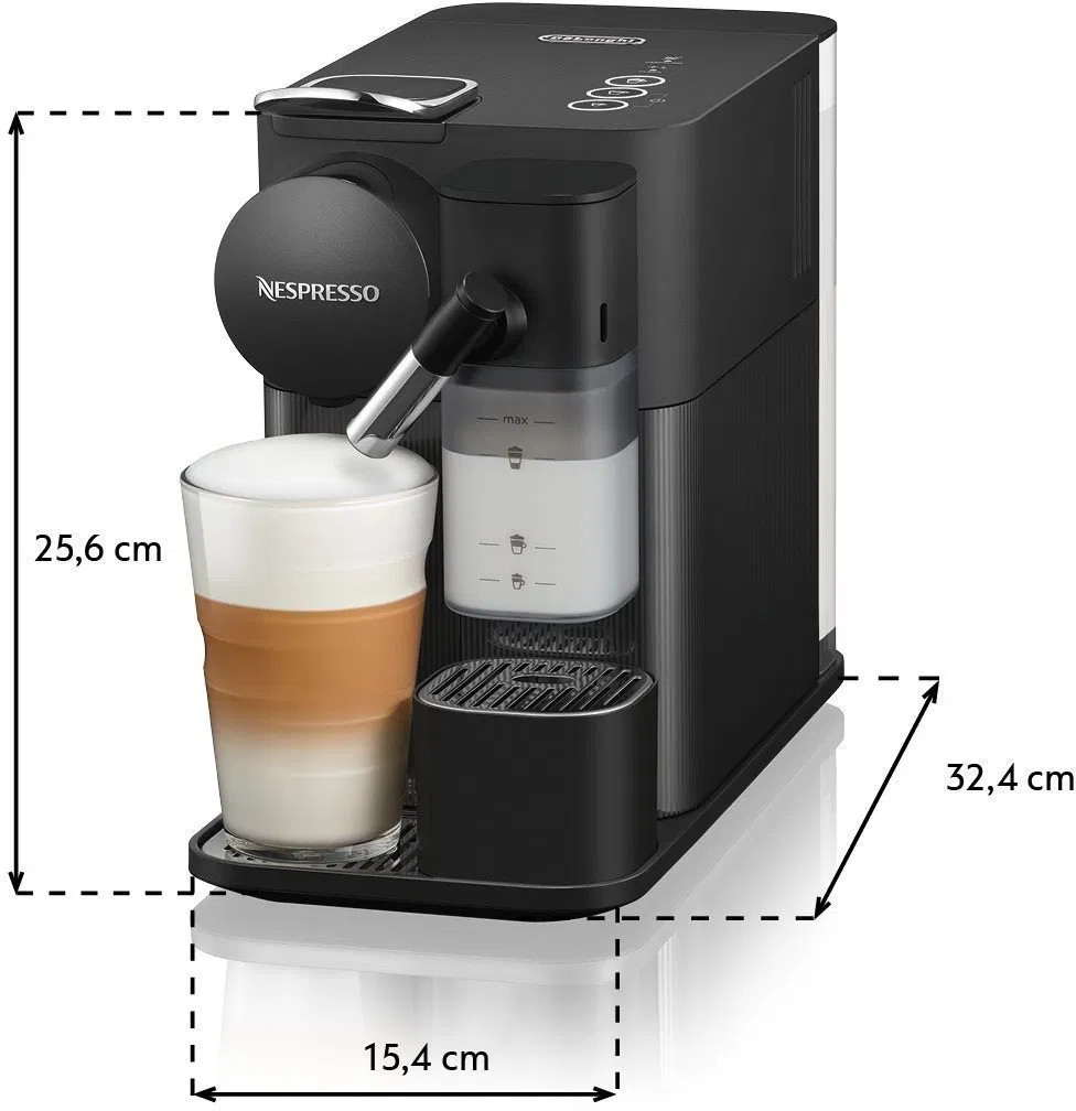 Kapszulás kávéfőző - Nespresso Original kapszulákhoz, 1450 W teljesítmény, 19 bar nyomás, víztartály űrtartalma 1 l, tartály 10 használt kapszulához, automatikus kikapcsolás, italkészítés egy gombnyomásra, víztartály, tejrendszer, manuális gombok, állítható magasságú állvány, állítható italméret, méretei 25,6 × 15,4 × 32,4 cm (ma × szé × mé), tömege 4,2 kg, fehér, fekete és ezüst kivitel