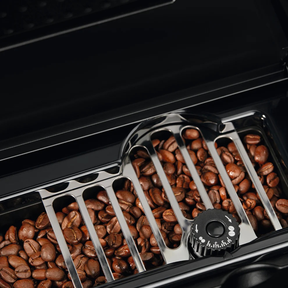15 bar nyomás, ujjlenyomatmentes inox felső szegély, beépített daráló szemes kávéhoz, elektronikus érintőkapcsoló, LCD-kijelző, két különálló melegítőegység kávéhoz és forróvízhez