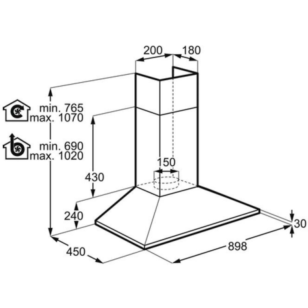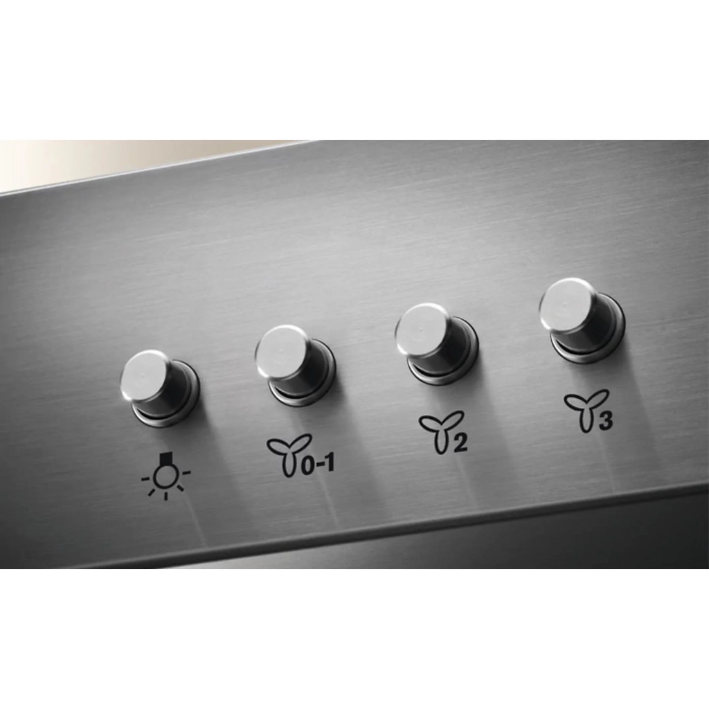 90 cm, inox, 3 fokozatú nyomógombos vezérlés, LED világítás
