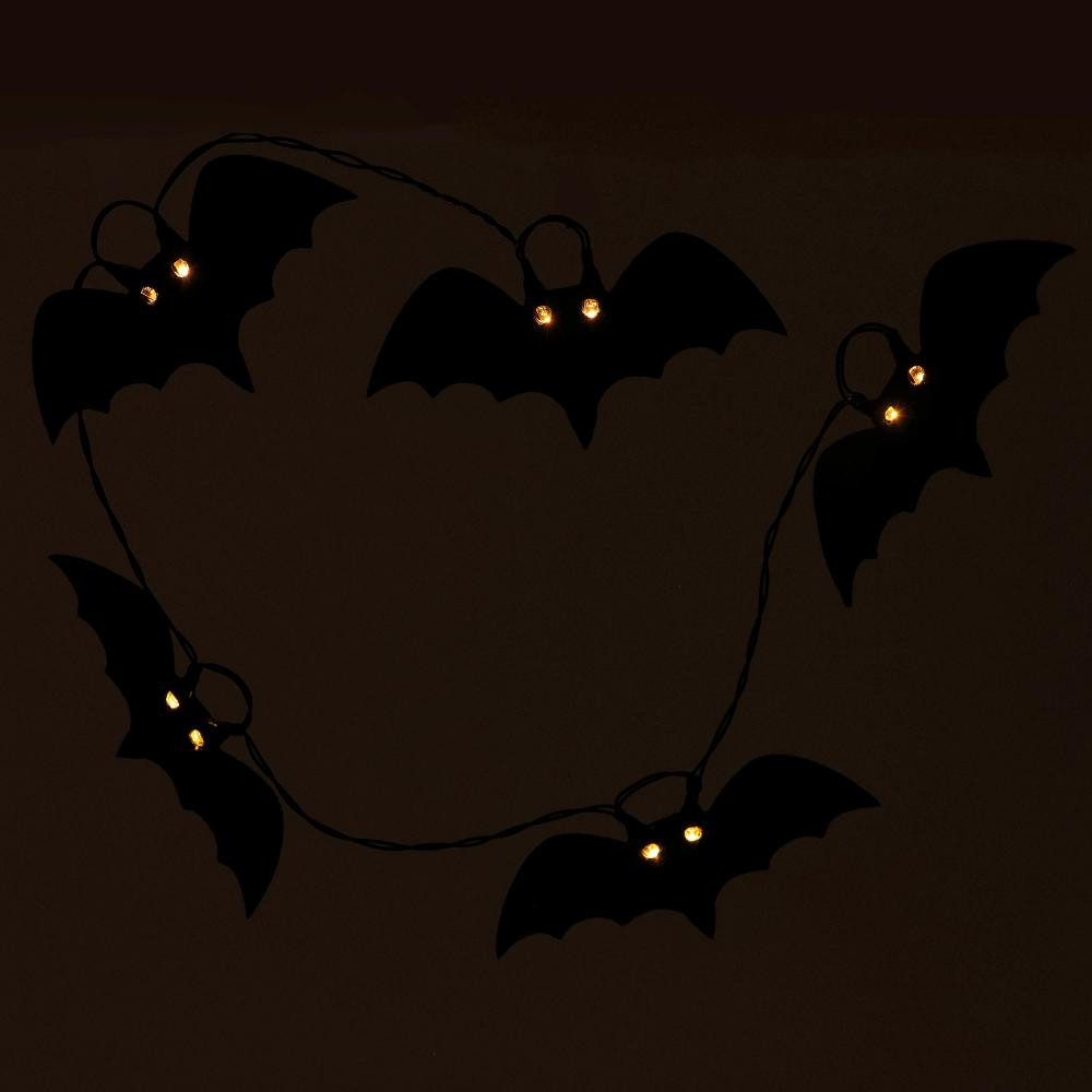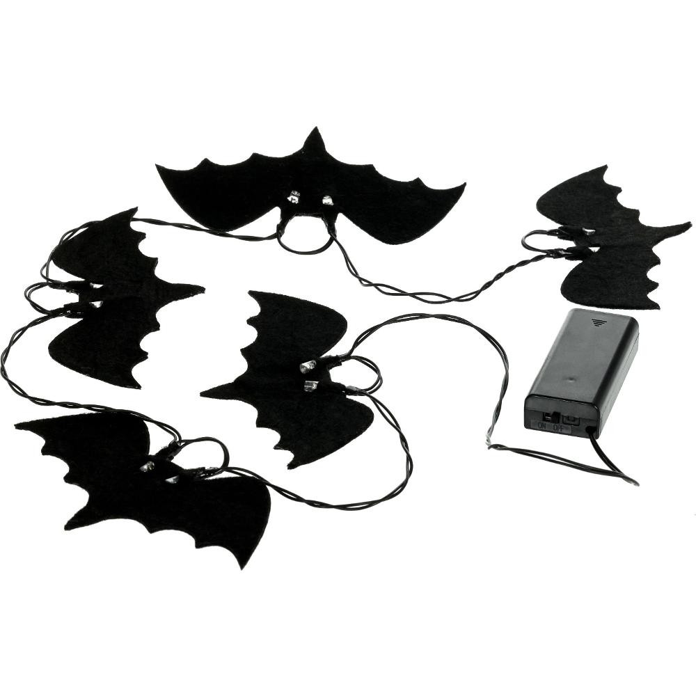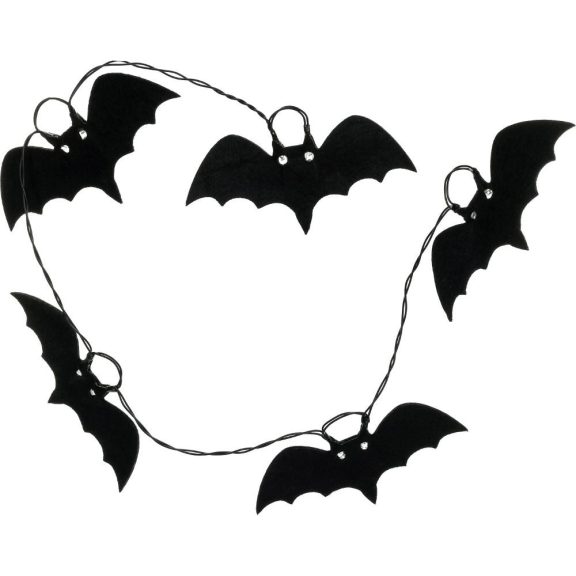 5 db aranyos, filcből készült fekete denevérrel, 10 db meleg fehér LED izzó, 2 db AA elemmel működik
