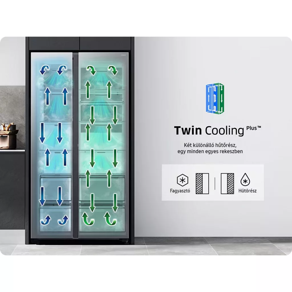 Biztosítja, hogy az élelmiszerek hosszabb ideig őrizzék meg nedvességüket és így maradjanak frissebbek*. A Twin Cooling Plus™ rendszer független párologtatók és ventilátorok segítségével optimalizálja a hőmérsékletet és a páratartalmat a hűtőszekrényben és a fagyasztóban. A legjobb körülmények között őrzi meg az élelmiszereket, és a szagok keveredésének megakadályozásával megóvja azok természetes ízét és aromáját. 3
