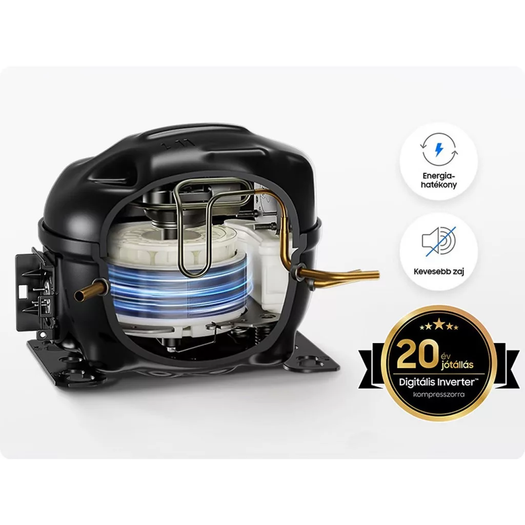 Tartsd egyenletesen hűvösen az élelmiszereket, és takaríts meg energiát! Az AI inverteres kompresszor továbbfejlesztett szerkezetének köszönhetően tehetetlensége 4,1x nagyobb, mint a jelenleg használt kompresszoroké*, így kevesebb energiát használ. AI algoritmus segítségével a használati szokásaidhoz igazítja a sebességét, miközben energiát takarít meg**. A kompresszorra 20 év jótállást vállalunk***. 11