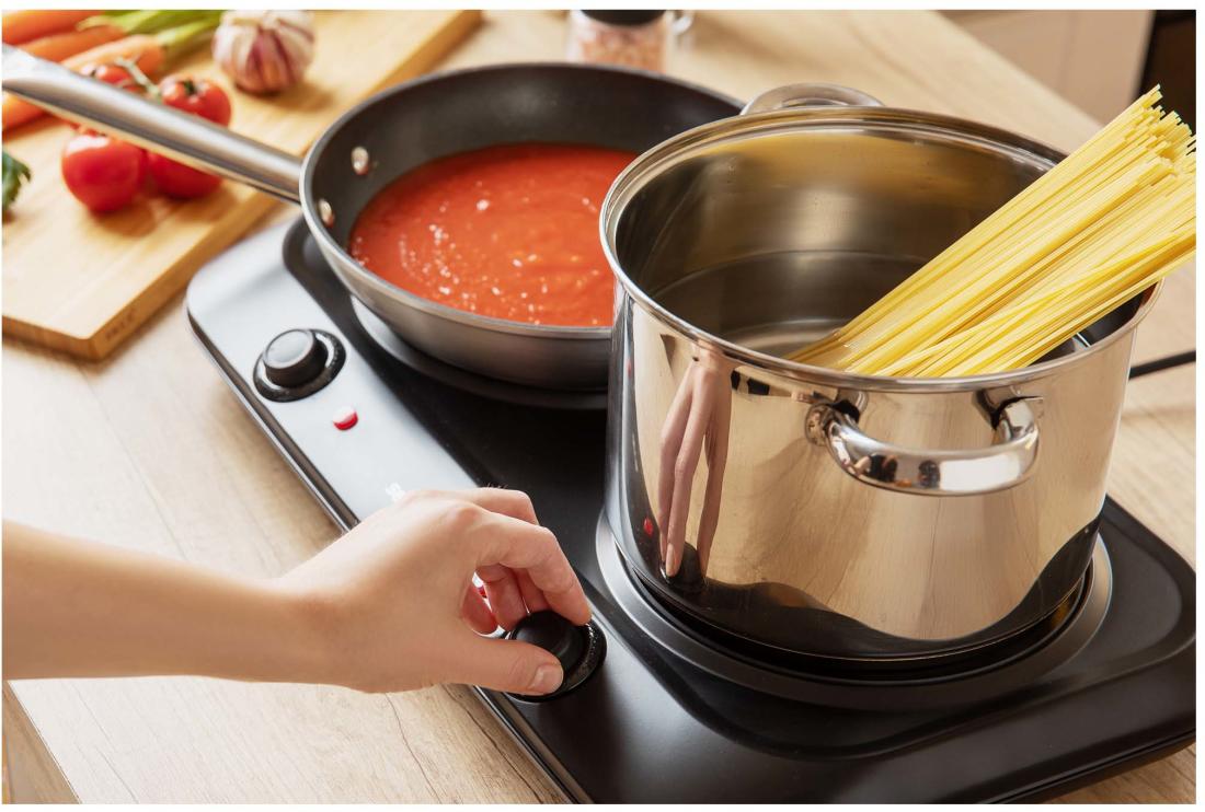 A két, egyenként 19 cm átmérőjű főzőlap segítségével könnyedén elkészíthet egy teljes menüt is, az edény anyagától kialakításától függetlenül. Az erős, 1200 W-os teljesítménynek köszönhetően az üvegkerámia felület néhány perc alatt akár 500 °C-ra, míg maga a serpenyő akár 250 °C-ra is felmelegszik. Így főzni, sütni, pirítani és melegíteni tud.