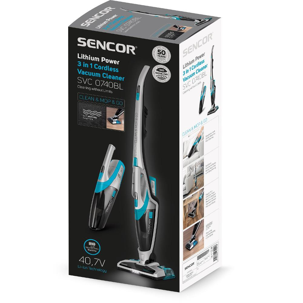 A Sencor SVC 0740BL-EUE3 porzsák nélküli álló porszívó. Ideális választás a lakás takarítására. Bármilyen felületen használható, padlótól kezdve a bútorokig. A 180°-ban elfordítható szívófej a nehezen hozzáférhető helyeket könnyen elérhetővé teszi. A működését egy 2200mAh Li-Ion akkumulátor biztosítja, amellyel a porszívó akár 85 percig is üzemeltethető. A szívóerőt az elektromos szabályzó segítségével állíthatja be. Az ergonomikus tervezésű fogantyú, a szívófejbe épített LED világítás biztosítja a pozitív felhasználói élményt. A készülék töltéséhez egy töltőállomás áll a rendelkezésre, mely praktikus tartozék tárolóval lett felszerelve.