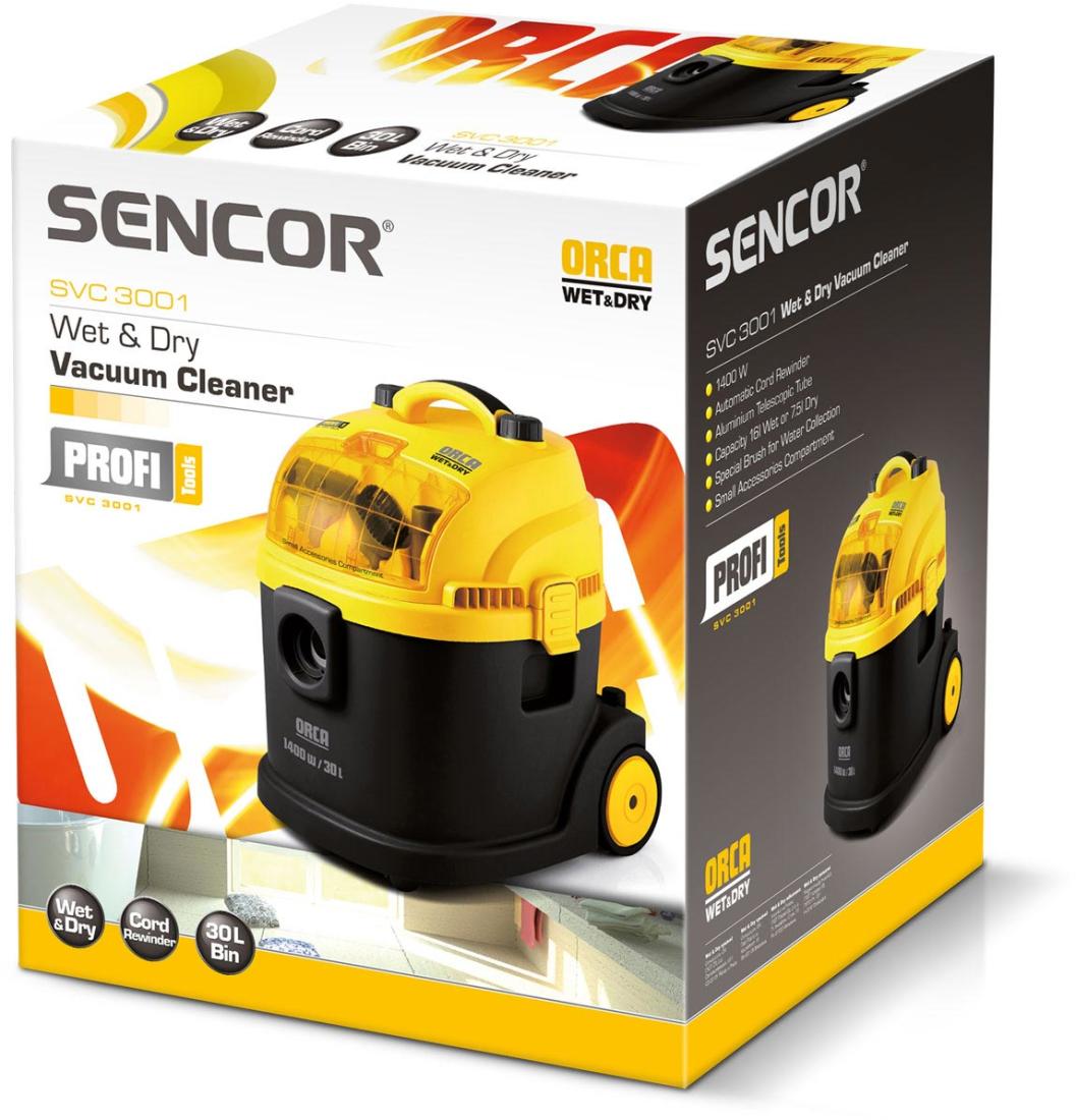 A Sencor SVC 3001 porzsákkal és porgyűjtő tartállyal is működő száraz-nedves porszívó. Ideális választás ház, lakás vagy iroda takarítására. Bármilyen felület porszívózásához tökéletes. A hatékony működést a 1400 W teljesítményű motor biztosítja, illetve a hosszú élettartam érdekében egy hőbiztosítékot építettek be a motor túlmelegedésének megakadályozására. A teleszkópos alumínium csőnek köszönhetően a porszívózás gyorsan és kényelmesen történik. A gumírozott kerekek megkönnyítik a porszívó mozgatását a padlón.Száraz-nedves technológiaA Sencor száraz-nedves porszívói ott is helytállnak, ahol Ön nem is gondolná. Nem jelenthet problémát a konyhába kiszóródó liszt vagy kifolyt tej, kakaó sem. A Sencor nedves-száraz porszívói egyszerűen könnyedén felveszi a harcot a különböző szennyeződésekkel.Porzsákos és porzsák nélküli kialakításLegyen szó száraz vagy nedves, durva vagy finom szemcsés szennyeződésről, a SENCOR többfunkciós porszívója bármilyen szennyeződéssel megbirkózik. A nagyméretű, 30 literes tartálynak köszönhetően nagyobb vízmennyiség sem jelent problémát. Ideális a lakás, garázs, pince vagy műhely takarítására, felújítási munkálatokhoz és bármilyen egyéb háztartási célra. A speciális cserélhető porzsák kapacitás 7,5 liter a víztartály pedig 16,0 liter.