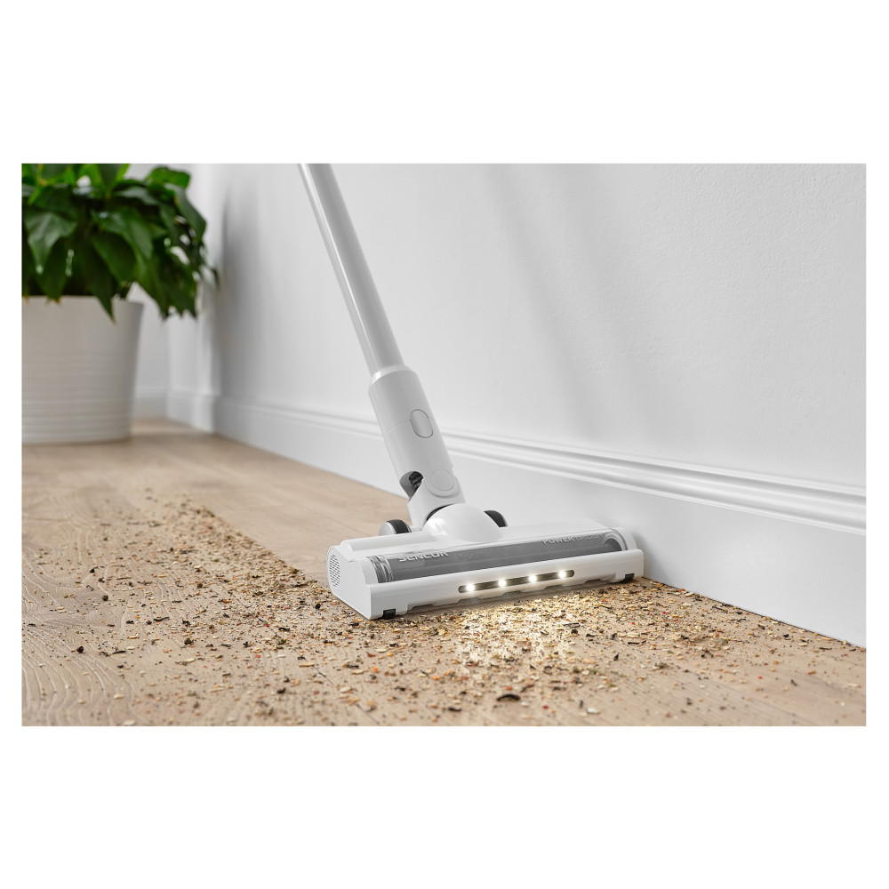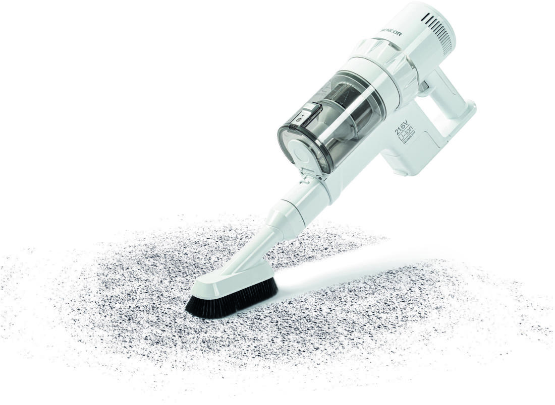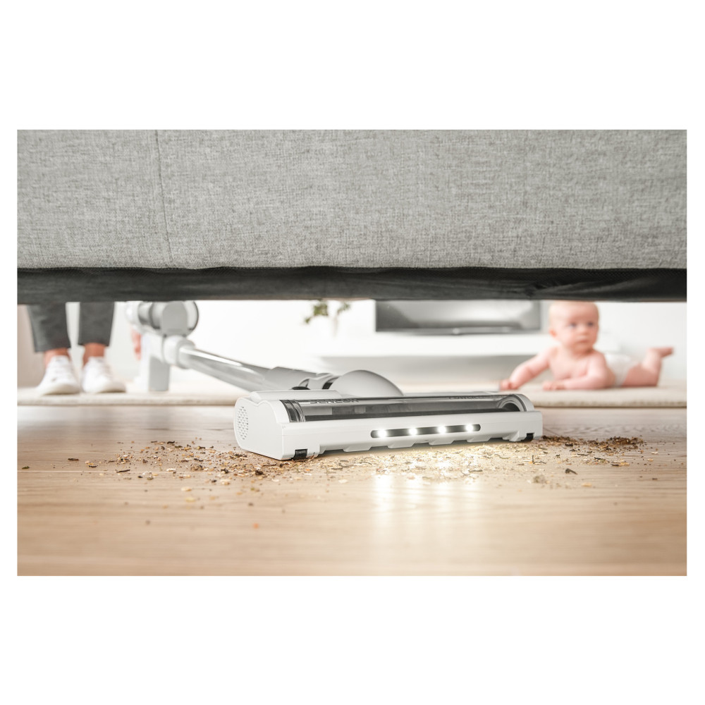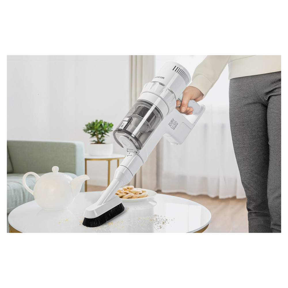 A Sencor SVC 7522WH akkumulátoros 2 az 1-ben kialakítású rúdporszívó kiváló segítőtárs a kényelmes és tökéletes takarításhoz. A készülékbe épített 250 W-os digitális motor garantálja az összes padlótípus hatékony porszívózását. A készülék könnyű és egyszerűen működtethető, amelynek köszönhetően a nehezen hozzáférhető vagy magas helyek is könnyedén takaríthatók. A LED lámpával ellátott szívófejjel a sötét helyek is kényelmesen és egyszerűen porszívózhatók.
