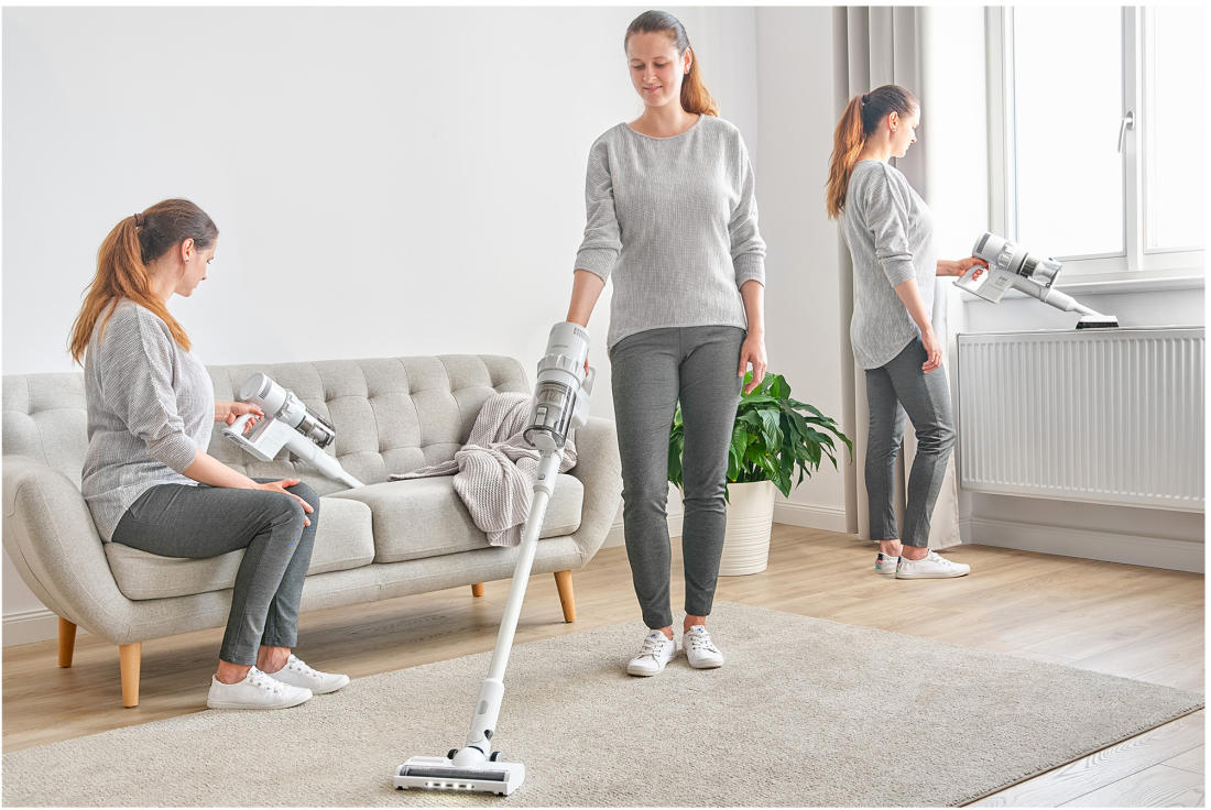 A takarítás jellegétől függően három teljesítményfokozat közül lehet választani. A TURBÓ üzemmód előnyösen használható a koncentrált vagy mélyebben található szennyeződések porszívózásához, a nagy teljesítmény pedig a normál takarításhoz. A hosszabb üzemeltetés üzemmóddal akár 45 percig is porszívózhat.