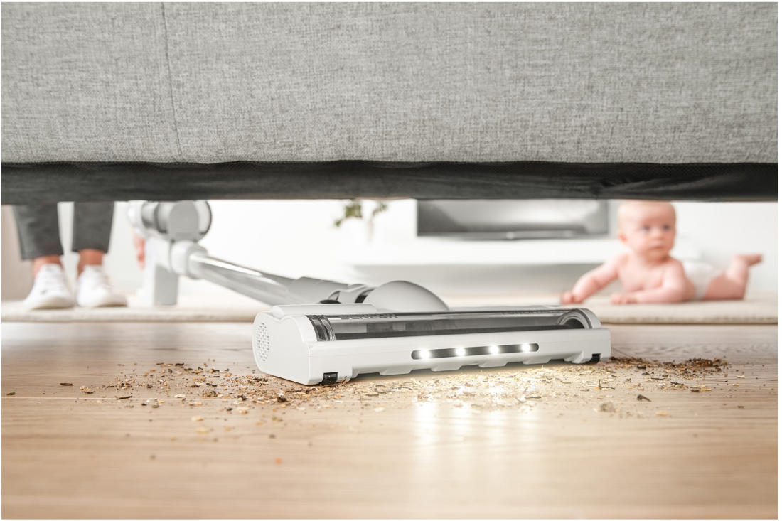 A LED világításnak köszönhetően megvilágíthatja az apró szennyeződéseket és a finom port. A LED világítótest stratégiailag a szívófej közepén lett elhelyezve, amely így megfelelő területet tud megvilágítani. A független motorral ellátott forgókefe kiváló eredményt biztosít bármilyen típusú padlón, és javítja a szőnyegekről származó szennyeződések felszívását. A 360°-os technológia lehetővé teszi a hozzáférést minden sarokhoz a padlótól a mennyezetig.