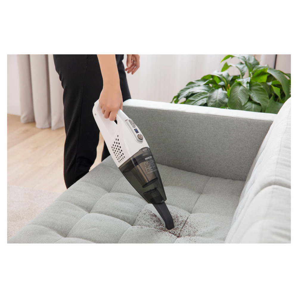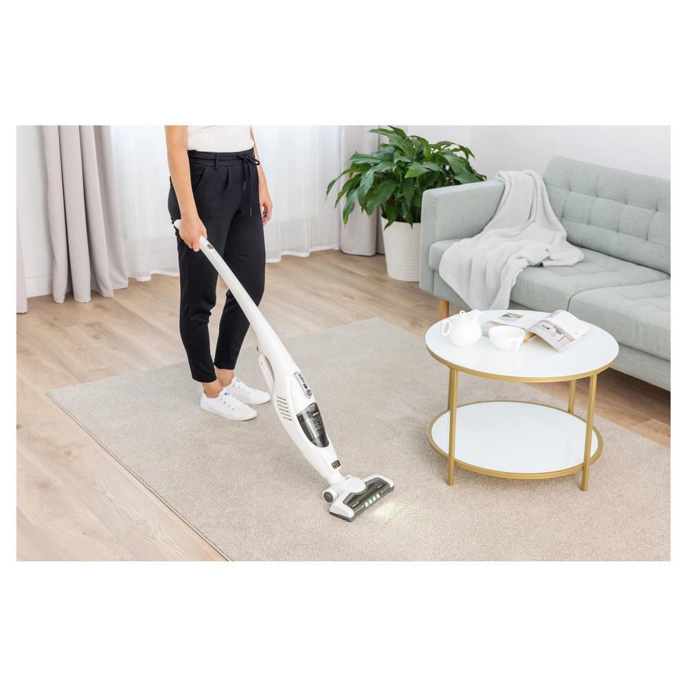 A Sencor SVC 7811WH porzsák nélküli álló porszívó. Ideális választás a lakás takarítására. Bármilyen felületen használható, padlótól kezdve a bútorokig. A 180°-ban elfordítható szívófej a nehezen hozzáférhető helyeket könnyen elérhetővé teszi. A működését egy 11,1 V, 2200mAh Li-Ion akkumulátor biztosítja, amellyel a porszívó akár 25 percig is üzemeltethető. A szívóerőt az elektromos szabályzó segítségével állíthatja be. Az ergonomikus tervezésű fogantyú, a szívófejbe épített LED világítás biztosítja a pozitív felhasználói élményt. A készülék töltéséhez egy töltőállomás áll a rendelkezésre, mely praktikus tartozék tárolóval lett felszerelve.