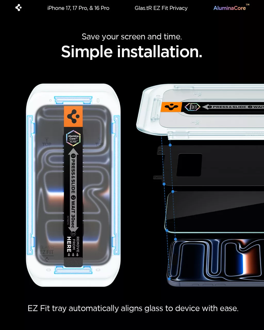 A Spigen GLAS.tR EZ Fit Privacy használatával azok is megbarátkozhatnak, akik eddig tartottak a védőüveg felhelyezésétől. A gyártó forradalmi újításának köszönhetően egy keret segítségével pontosan és egyszerűen lecserélheti Ön is készüléke kijelzőjén a védőüveglapot.