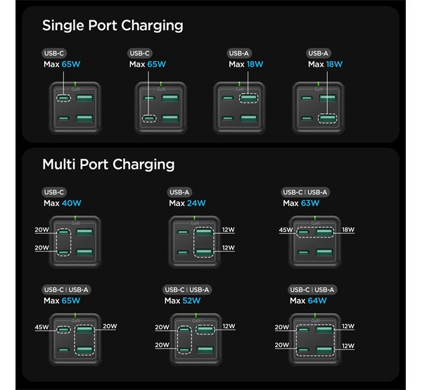 Spigen PowerArc PD2101 hálózati töltő állomás, 2xUSB-C + 2xUSB-A, 65W, EU-s + angol tápkábellel, fekete