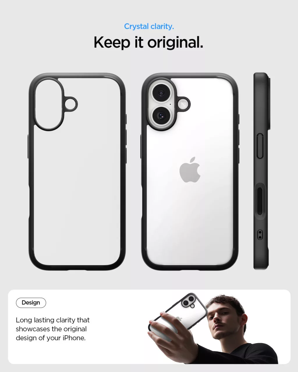 A Spigen Ultra Hybrid tok tökéletes egyensúlyt képez a védelem és a stílus között, biztosítva a készülék eredeti megjelenésének kiemelését fekete hátlapjával, miközben erős, ütésálló kerete kiváló védelmet nyújt. Az edzett polikarbonátból készült hátlap ellenáll a karcolásoknak, míg a TPU keret elnyeli az ütődéseket és segít megőrizni a telefon sérülésmentes állapotát.