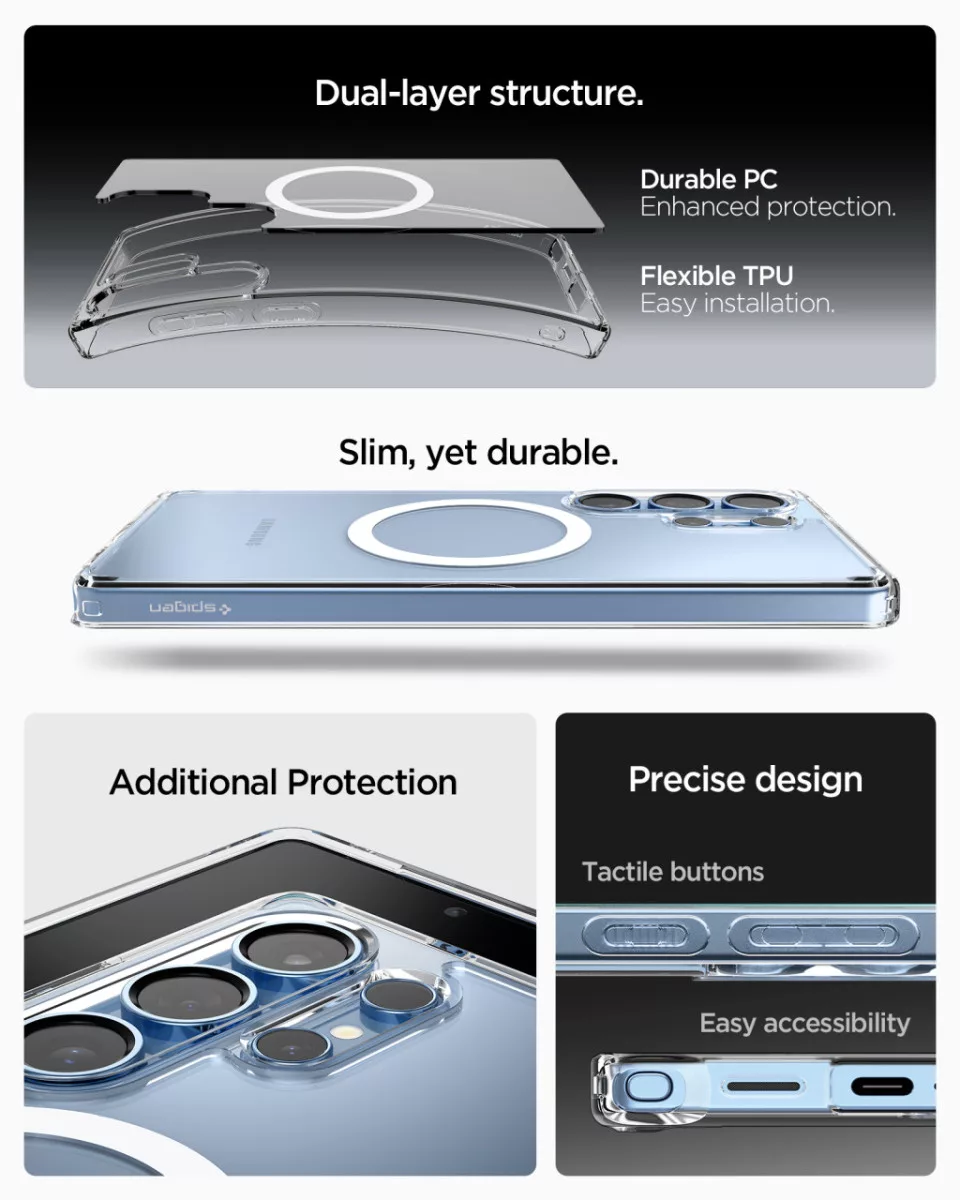 A Spigen Ultra Hybrid Mag tok a népszerű Ultra Hybrid sorozat legújabb fejlesztése, amely kiterjeszti a klasszikus átlátszó tok védelmét mágneses technológiával. Ez a tok integrál egy mágneses gyűrűt, ami kompatibilis az Apple MagSafe technológiájával, így lehetővé teszi a gyors és biztonságos mágneses töltést, valamint a különféle MagSafe tartozékok használatát anélkül, hogy le kellene venni a tokot. Az Ultra Hybrid Mag továbbra is biztosítja a kiváló ütésálló védelmet, köszönhetően a merev polikarbonát hátlapnak és rugalmas TPU keretnek. Az átlátszó hátlap tökéletesen mutatja be a telefon eredeti designját, miközben a kiemelt keretek extra védelmet nyújtanak a kamera és a képernyő számára.