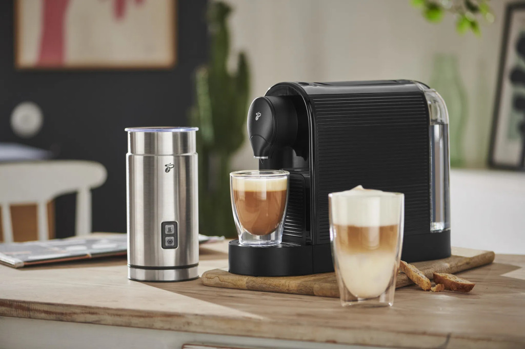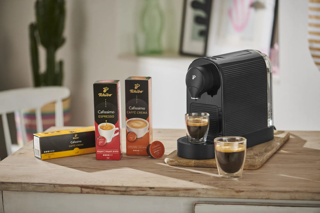 Kapszulás kávéfőző - Tchibo Cafissimo kapszulákhoz, 1250 W teljesítmény, 15 bar nyomás, víztartály űrtartalma 0,8 l, tartály 6 használt kapszulához, automatikus kikapcsolás, italkészítés egy gombnyomásra, víztartály, manuális gombok, tárolóhely a poharaknak, állítható italméret, méretei 24 × 11,9 × 33,7 cm (ma × szé × mé), tömege 2,7 kg, fekete kivitel