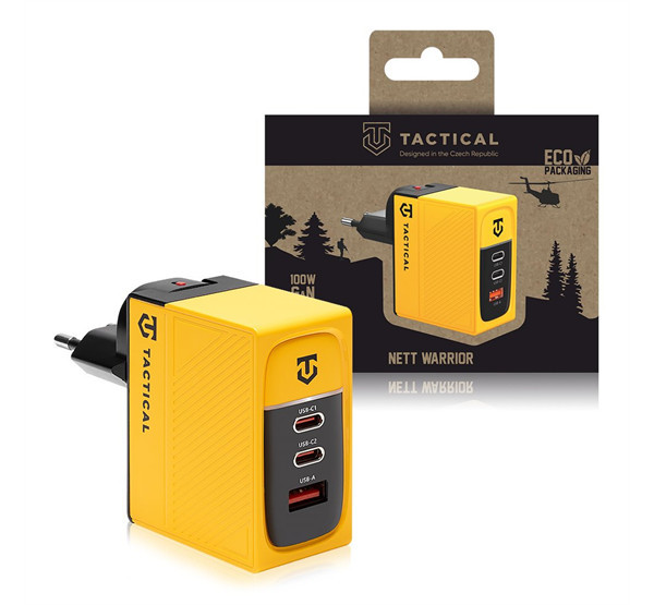 Tactical Nett Warrior GaN 100W töltővel nem kell többé aggódnod az eszközeid akkumulátorának töltöttsége miatt. Ez a töltő a GaN technológiát alkalmazza, amely lehetővé teszi a nagy teljesítményű töltést rendkívül kompakt méretekben. Emellett kiemelkedő hatékonysággal, kisebb méretekkel és hosszabb élettartammal rendelkezik más töltőkhöz képest. Az összesen 100W-os teljesítmény biztosítja, hogy MacBook-ját, iPad-jét vagy más notebookjait és tablettjeit gyorsan tölthesse. A 100W-os teljesítmény nem oszlik meg, tehát valóban 100W-ot tudsz kihúzni egy USB-C portból, nem csak az összes port teljesítményét adja össze. Összesen három porttal rendelkezik: 2xUSB-C és 1xUSB-A port. A Tactical Nett Warrior sokféle gyors töltési szabványt támogat, beleértve a PPS-t, PD3.0-t, QC3.0-at, Samsung AFC-t, Huawei-t, BC1.2-t és az Apple-t is.