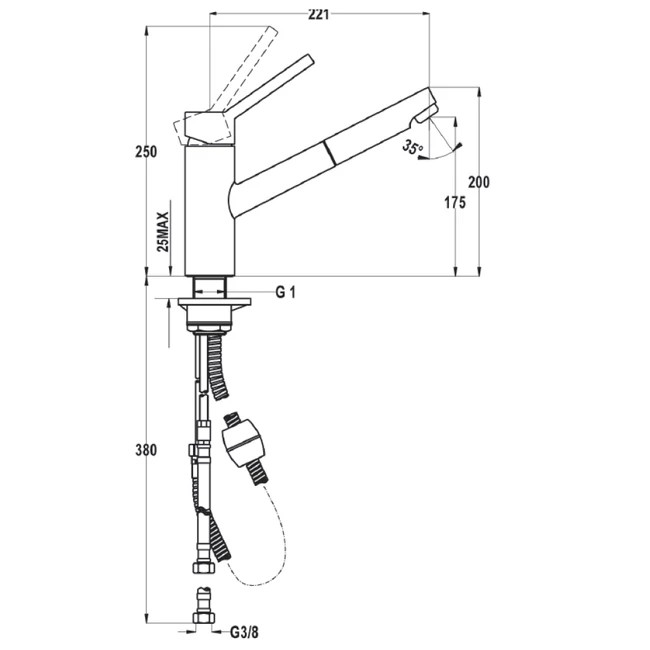 Fém kihúzható1 funkciós zuhanyfejjelForgatható kifolyócsővelVízkőmentes perlátor