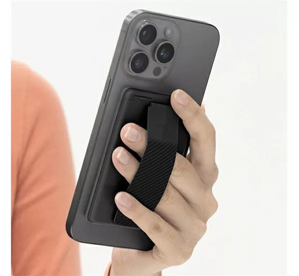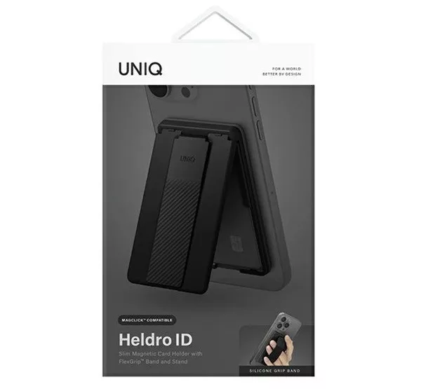 A Uniq Heldro ID egy sokoldalú, mágneses kártyatartó, amely egyben telefontartóként és kényelmes fogásként is funkcionál.