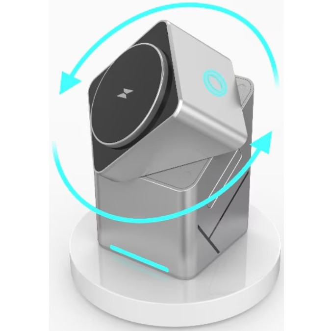 A töltő kialakítását nemcsak a minimalista, elegáns formatervezés, hanem mindenekelőtt a fejlett modulrendszer különbözteti meg a többitől. A fő töltőmodulja forgó mechanizmussal van felszerelve, amely lehetővé teszi az iPhone két síkban történő töltését - függölegesen a kényelmes képernyő megtekintéséhez vagy vízszintesen a felhasználó preferenciája szerint.