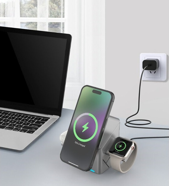A Geometric Charger 3in1 Qi2 innovatív megoldás három Apple-eszköz egyidejű töltésére. Automatikusan érzékeli a csatlakoztatott eszközt, és annak energiaigénye alapján beállítja az optimális töltési módot, így biztosítva a teljes hatékonyságot és biztonságot.