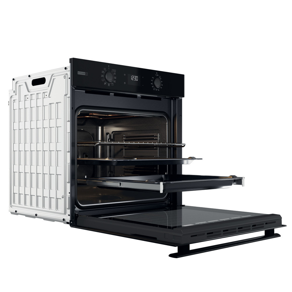 Beépíthető elektromos sütő, "A+" energiaosztály, full fekete üveg készülékszín Katalitikus panel, gőz funkciók, süllyeszthető kezelőgombok, digitális kijelző, finoman csukodó sütőajtó, Teleszkópos sütősín 71 liter, 59,5x59,5x55,1 cm