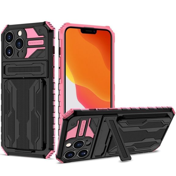 Apple iPhone 12 Pro, Műanyag hátlap védőtok szilikon belső, közepesen ütésálló, kitámasztóval, kártyatartóval, Wooze Transformer, fekete/rózsaszín