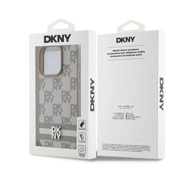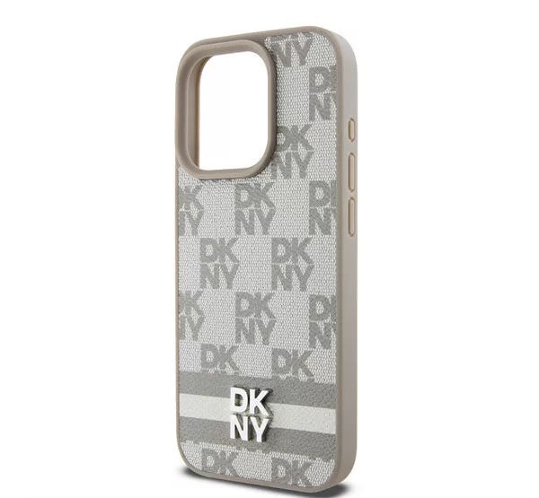 DKNY PU Leather Checkered Pattern and Stripe Apple iPhone 15 Pro tok, bézs