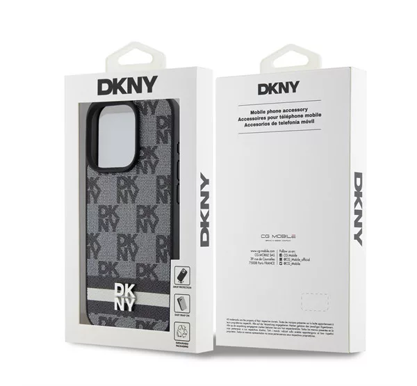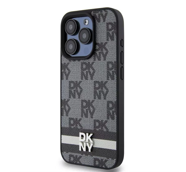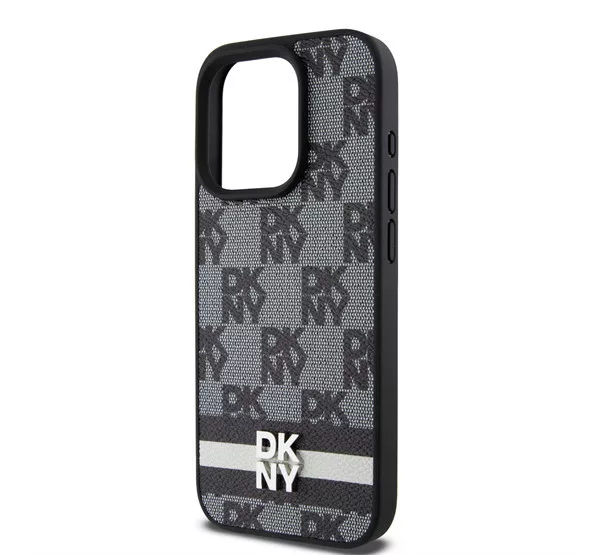 DKNY PU Leather Checkered Pattern and Stripe iPhone 14 Pro hátlap tok, fekete
