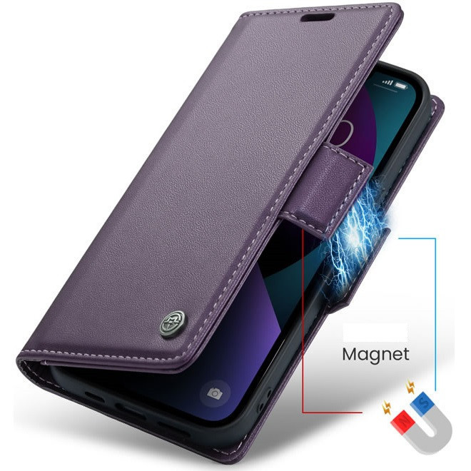 Apple iPhone 16e / 17e, Oldalra nyíló tok, stand, kártyatartóval, RFID technológiával, Wooze CaseME, lila