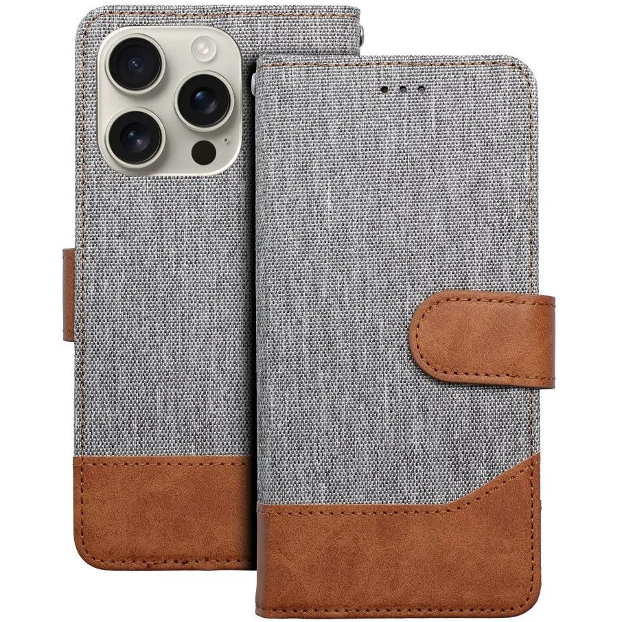 Apple iPhone 16e / 17e, Oldalra nyíló tok, stand, kártyatartóval, farmer minta, Jeans Book, szürke