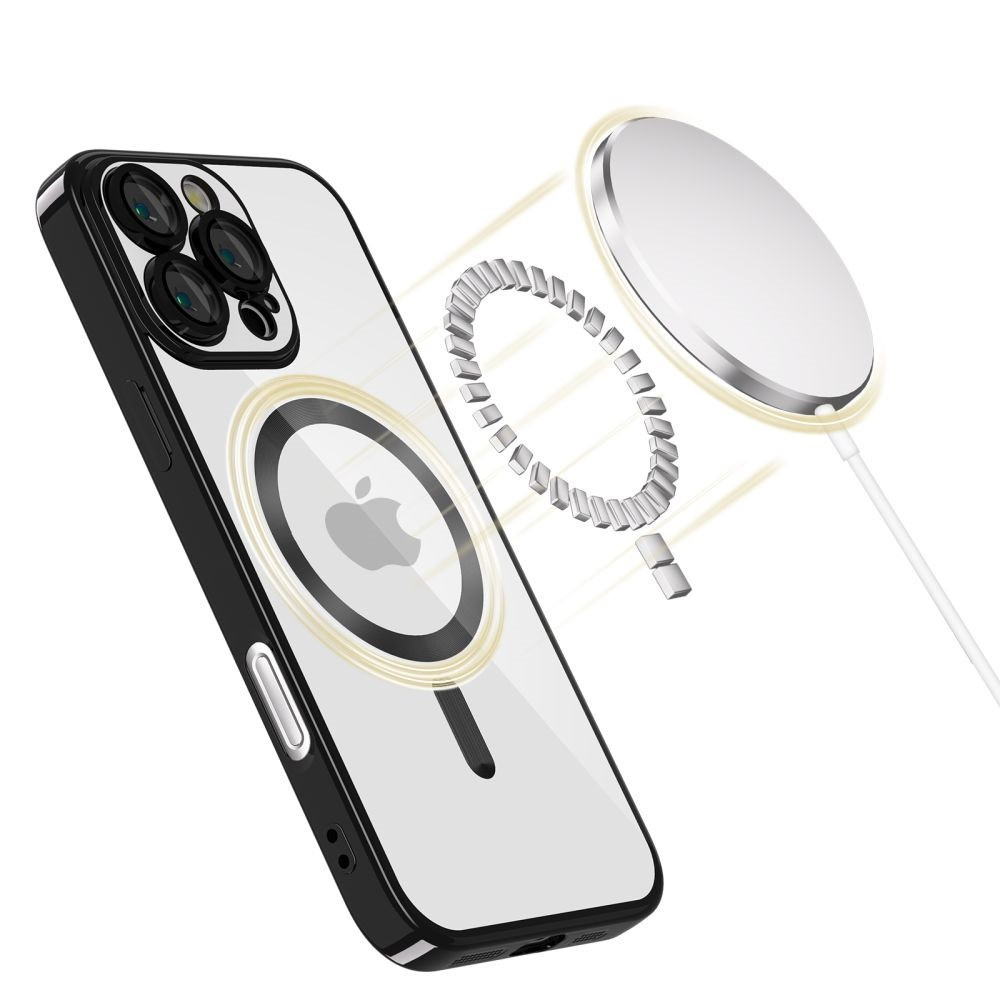 Apple iPhone 16 Pro, Műanyag hátlap védőtok + szilikon keret, közepesen ütésálló, Magsafe töltővel kompatibilis, fényes keret, Magflex Magsafe, átlátszó/fekete